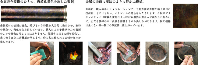 富山県高岡市で400年以上の歴史を持つ伝統的な技法と日々研究された新しい技術から生まれる金属着色の色は、金属に彩り豊かな表情を与えます。