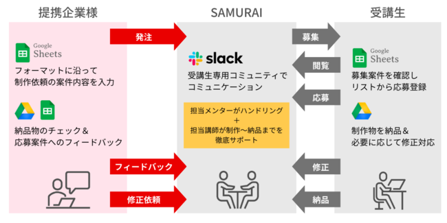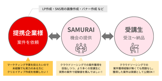 提携企業様の持つクリエイティブ案件を、当社がハブになることで、侍エンジニアで学ぶ受講生に発注していただけるサービスです。なお、提携企業様は無料でクリエイティブの募集をかけることができ、案件(受講生)に対する報酬は発生しません。