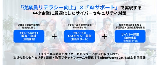 本パッケージは、イスラエル国防軍のサイバーセキュリティ手法を取り入れた、次世代型のセキュリティ訓練・教育プラットフォームを提供するAironWorks Co., Ltd.と共同で開発されたサービスパッケージで、不審メールに対する「実践訓練」および「AIスキャン」に加え、万一の有事の際に必要となる原因調査・復旧作業費を補填する「サイバー保険」を自動付帯しています。