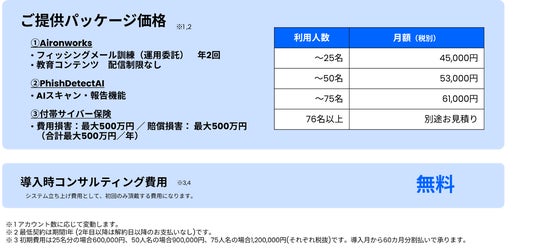 本パッケージは、AironWorks Co., Ltd.との提携を通じて、中小企業様にもご利用いただきやすい小口パッケージを当社取扱の特別プランとして組成したことで、月額45,000円から充実のサイバーセキュリティ対策を導入いただけます。