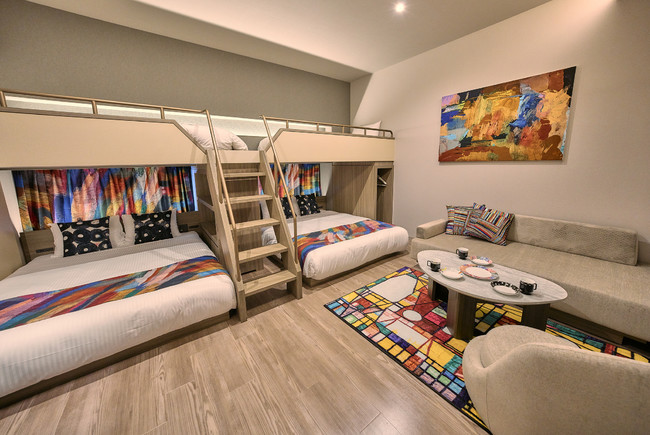 「FAV HOTEL 広島スタジアム」は、ホテル全体を「和」テイストで統一し、落ち着いた癒しの空間を演出しています。当ホテルブランドの特徴であるバンクベッド(2段ベッド)が設置されたゲストルームには、下段にはクイーンサイズのベッド、上段にはシングルベッドが2台ずつあり、最大6人で泊まることができます。子供はもちろん、大人も童心に返れる非日常感を味わっていただけます。加えて、小さなお子様連れのご家族にも、ストレスなく旅行を楽しんでいただきたいとの思いから、オムツやおねしょパッドなどの子供用貸し出し備品を20種類ほど揃え、備え付けの食器も軽くて割れにくいものを選定しています。
