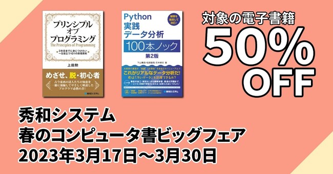 株式会社秀和システム(東京都・代表取締役会長兼社長 上田智一)は、2023年3月17日から3月30日まで、Kindleストアをはじめとした8書店にて、コンピュータ書ジャンルで人気の電子書籍200タイトルが50%OFFとなる「秀和システム 春のコンピュータ書ビッグフェア」を行います。