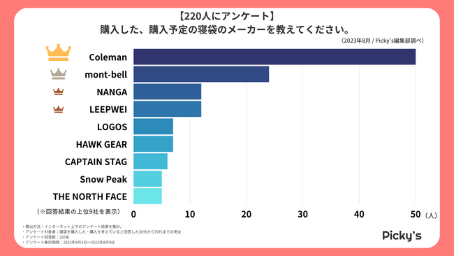 購入した、購入予定の寝袋のメーカーで最も多く選ばれたメーカーは「Coleman(コールマン)」でした。