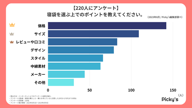 「Picky’s」は、インターネットショッピングにおいて、購入前に試せない・選ぶべきものがわからないという課題の解決を目標に、あらゆる商品のおすすめランキングや検証レビューを紹介するサイトです。このたびPicky’s(https://rentry.jp/note/)では、アウトドアシーズンに先駆けて、寝袋についてインターネット上でアンケート調査を行いましたので発表いたします。
