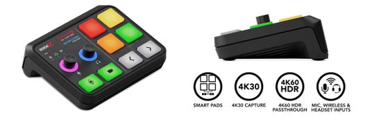 セットアップを邪魔しないコンパクトなサイズにも関わらず、4K対応キャプチャーボード、高音質オーディオインターフェース、片手で操作可能なコントロールボタンを搭載しています。本体右側には4つの「SMARTパッド」を備え、サンプラーや音声エフェクトの切り替えのほか、MIDIメッセージの送信もでき、抜群の操作性を提供します。
