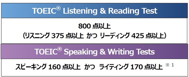 ※1 TOEIC Speaking Testは、スピーキング160点以上(TOEIC S&WのTOEIC Writing Testで170点以上を取得する必要あり)