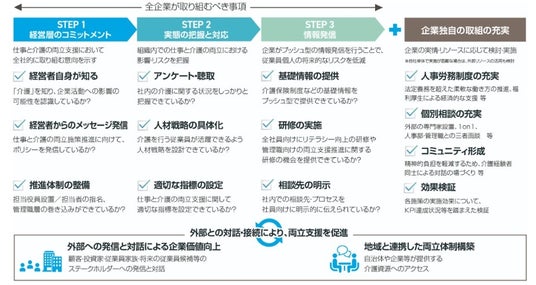 介護と仕事の両立支援について企業経営上の優先順位が低く、取組が進まないという課題があります。そのため、経済産業省の経営者向けガイドラインにおいても「経営者自身が知る」「経営者からのメッセージ発信」をSTEP1としていますが、人事部・推進担当から経営層に対して伝える難易度が高いという声が多数あります。