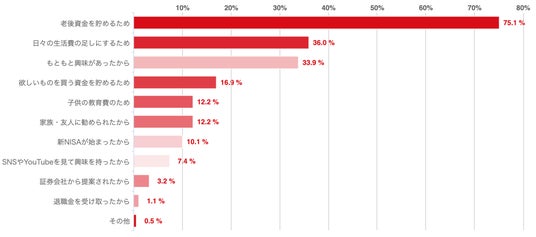 アンケートによれば、サラリーマンが資産運用を始めた理由としては「老後資金を貯めるため」が75.1%を占める結果となった。また、「日々の生活費の足しにするため(36.0%)」や「もともと興味があったから(33.9%)」などの理由も挙げられた。