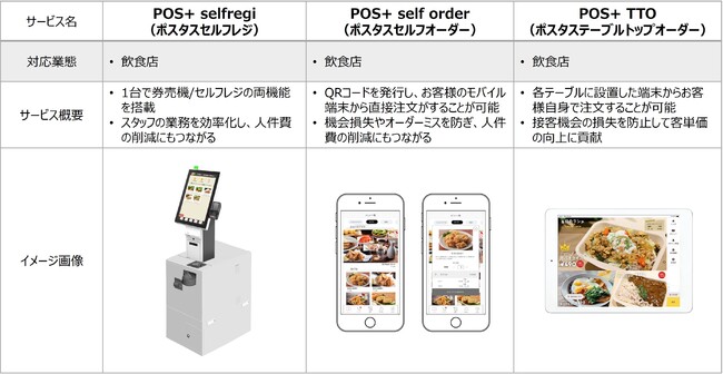 「POS+」は、店舗の売上向上や店舗運営担当者の業務負担軽減による生産性向上を実現し、また従業員にとって 利便性の高い機能を搭載する店舗向けソリューションです。飲食店向け「POS+ food」や小売業向け「POS+ retail」、理美容向け「POS+ beauty」のクラウド型モバイルPOSレジをはじめ、セルフレジ・券売機「POS+ selfregi」、モバイルセルフオーダーサービス「POS+ self order」、テーブルトップオーダーサービス「POS+ TTO」などの様々なソリューションで、効率的な店舗運営を支援いたします。
