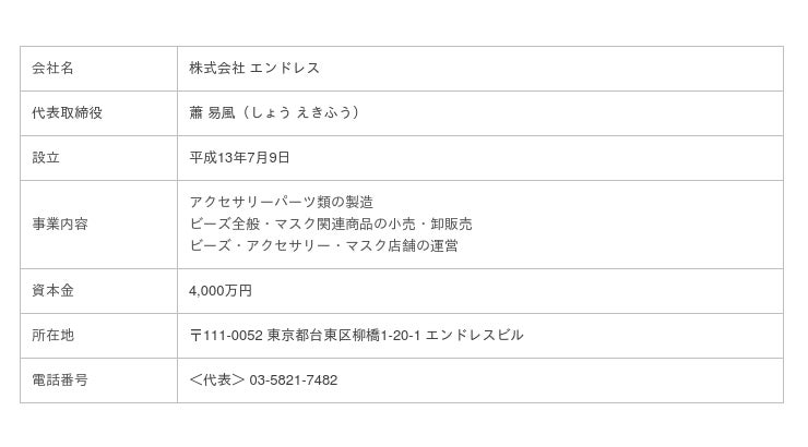 ビーズ・アクセサリーパーツを取り扱うショップ「PARTS CLUB(パーツクラブ)」を全約90店舗運営する株式会社エンドレス(本社:東京都台東区、代表:代表取締役 蕭(しょう)易風(えきふう))は、マスク専門ブランド「MASK CLUB(マスククラブ)」を立ち上げ、2020年7月7日(火)に「MASK CLUB」オンラインストアをオープンしました。