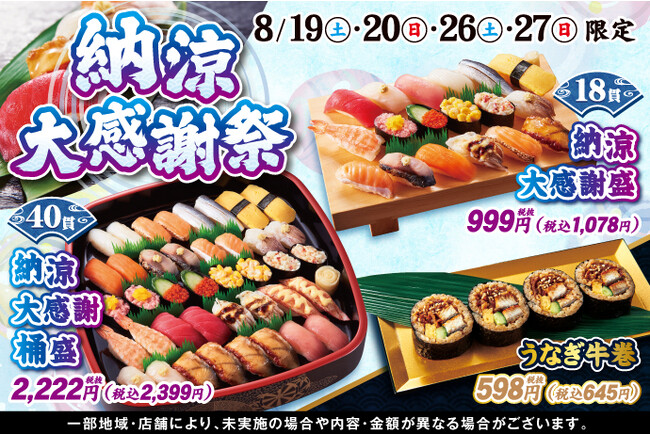 持ち帰り寿し店の「小僧寿し」「茶月」を運営する株式会社小僧寿しは、持ち帰り寿し店「小僧寿し」にて、8月19日(土)~20日(日)・26日(土)~27日(日)の期間限定で、『納涼大感謝祭』を開催致します。