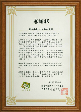 また、代表理事の今村さんより、「震災当時12歳だった子が、お給料から寄付をし、次の世代の子どもを支える側に回ってくれるようになりました。3.11の震災の記憶をはっきりと持たない子どもたちも、東北には少しずつ増えてきました。ハタチ基金はそうした子どもたちが成人するまで寄り添い、励まし支えていく存在でありたいと願っています。」と感謝状を贈呈いただきました。