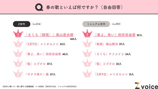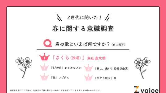 また、「春の歌といえば何ですか?」という質問に対して、Z世代の圧倒的1位は森山直太朗さんの「さくら(独唱)」であることが判明。