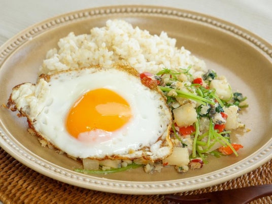 人気の「ガパオライス」の魚バージョンで、挽肉の食感に近い冬が旬の「たら」を使用しています。魚のうま味は素材の「たら」とミツカンの「〆まで美味しい 焼あごだし鍋つゆミニパック」で再現。ナンプラーは使用せず、バジルの代わりの「ゆず」や「みつば」等なじみのある食材を使っているので、年代問わずお召し上がりいただけます。豊かな風味がアクセントになり食が進みます。