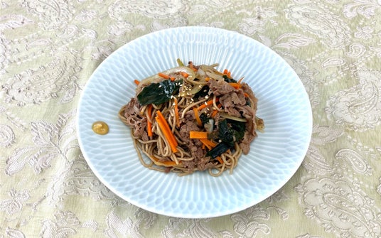 そばを韓国のチャプチェ風にアレンジした一品です。春が旬のわかめは、火を通すことで栄養素を効率的に摂取することができます。油と一緒に食べることでβ-カロテンの体内への吸収率向上が期待できます。