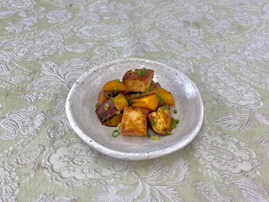 秋が旬の柿とさつまいもを使い、みそを基本とした馴染みのある食べやすい味付けです。果物の中でも国内生産量が多い柿を使用することで、自給率向上にもつながります。柿を焼くという斬新さは、一緒に食べる人と驚きを共有したくなる一品です。