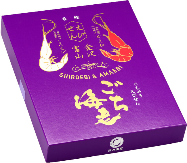 富山米100%で焼き上げた生地に衣をつけて揚げています。「ごち海老」の品名にふさわしい、しっかりとした「えび」味を楽しめます。中はしっかりした焼き米菓の食感、表面はサクッと軽い揚げ食感。衣に白えびを贅沢に使用し、5層構造の味を重ねています。とにかく手間ひまをかけて作ったおせんべいです。