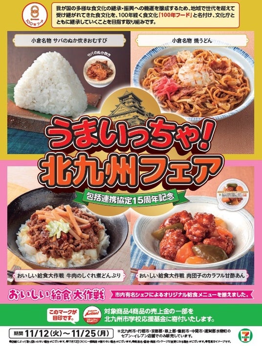 ついては、これを記念し、北九州伝統の食文化や学校給食の魅力向上の取組「おいしい給食大作戦」にちなんだオリジナルメニュー計4品を販売する「うまいっちゃ!北九州フェア」を開催します。