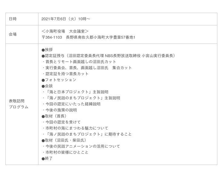 日本中に残された海にまつわる民話を発掘し、その民話のストーリーと、そこに込められた「想い」「警鐘」「教訓」を、親しみやすいアニメーションとして映像化します。当日は、認定委員長をはじめとする事務局メンバーが「海ノ民話のまち」として認定した10つのエリアのうちの1つである長野県小海町の黒澤弘町長を表敬訪問し、「海ノ民話のまち」認定証贈呈式を行いました。