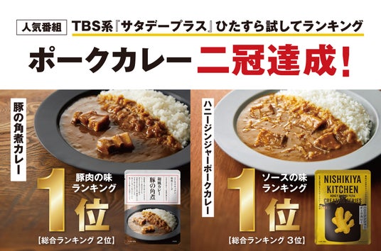 「世界の料理を『カンタン』に。」をコンセプトに掲げ、レトルトカレーやスープなどを販売するレトルト食品専門店NISHIKIYA KITCHEN(ニシキヤキッチン)(株式会社にしき食品 本社:宮城県岩沼市、代表取締役:菊池洋)の商品「豚の角煮カレー」「ハニージンジャーポークカレー」が、TBS系『サタデープラス』の大人気コーナー「ひたすら試してランキング」の「ポークカレー」部門にて、二冠を達成しました。直後から、オンラインショップと店舗で大きな反響を頂いて多くのお客様にお買い求めいただいています。商品によっては最大約650倍の売上を記録するなど、一時完売しましたが、工場を緊急でフル稼働することで増産体制をとり、引き続き、絶賛販売中です。この機会にぜひお買い求めください。