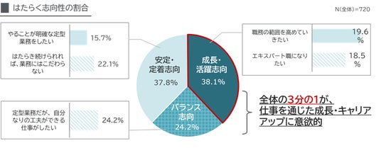 仕事に対する「はたらく志向」について調査したところ、新たな仕事に挑戦し自己成長を目指す「成長・活躍志向」(38.1%)が、安定した定型業務を続けたい「安定・定着志向」(37.8%)をわずかに上回りました。はたらく障害者の約4割が、仕事を通じた成長・キャリアアップに意欲的であることが読み取れます。