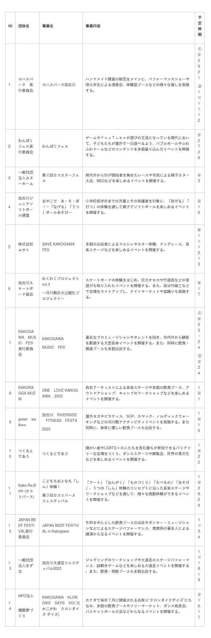 2023年度も昨年度に引き続き、補助金上限100万円を全額補助し、今年度は食やスポーツ、音楽、体験型イベントなど14件の事業を採択、実施されることとなりましたのでお知らせいたします。
