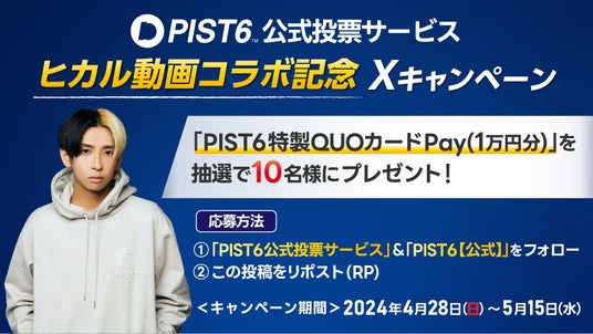 カリスマクリエイターのヒカルとの動画コラボを記念いたしまして、「PIST6公式投票サービス」公式ホームページ・公式Xにて特別キャンペーンを実施いたします。各キャンペーンの詳細につきましては、公式ホームページをご確認ください。