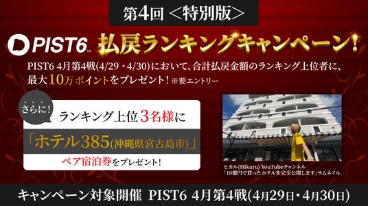 2024年4月29日(月・祝)・4月30日(火)開催の「PIST6 4月第4戦」において、「PIST6公式投票サービス」における払戻金額のランキング上位者に最大10万ポイントをプレゼント!さらに!今回は特別版として、ランキング上位者3名様にヒカルが10億円で購入したホテル「ホテル385(沖縄県宮古島市)」のペア宿泊券をプレゼント!