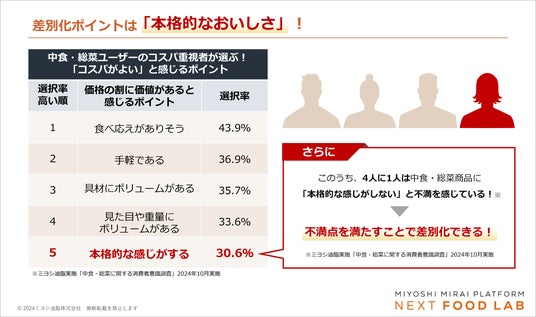 ミヨシ油脂の独自調査により、中食‧総菜商品の最たる特徴である「手軽である/時短になること(タイムパフォーマンス=タイパがよい)」に加え、「価格の割に価値があること(コストパフォーマンス=コスパがよい)」が重視されていることがわかりました。さらに、中食‧総菜を日ごろから購入している消費者に「コストパフォーマンスがよい」と感じるポイントや不満に感じているポイントを聴取したところ、差別化ポイントは「本格的なおいしさ」であることがわかりました。そこで、ミヨシ油脂は「コスパもタイパもきわめたい」という消費者の考え方に注目し、タイパも本格的なおいしさも重視する消費意識を「タイパきわみ消費」と名付けました。