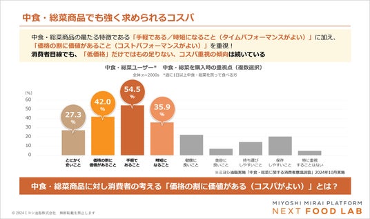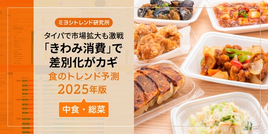ミヨシ油脂株式会社(本社:東京都葛飾区、代表取締役社長兼CEO兼CBO:三木逸郎)は、独自調査などを活用し、「消費者意識からひも解く食のトレンド予測2025年版」を発表しました。タイムパフォーマンス(タイパ)重視の傾向は続き、それにより中食・総菜市場が拡大するなか、2025年、消費者が中食・総菜に求めるトレンドのキーワードは、タイパも本格的なおいしさも重視する消費意識「タイパきわみ消費」と予測。その内容を、新事業・商品開発に役立つ情報を発信するWebサイト「ミヨシ未来プラットフォーム」で2024年12月17日から公開、専用フォームから資料のダウンロードもできます。