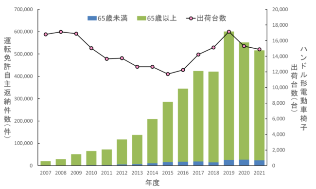 図2 運転免許自主返納件数とハンドル形車椅子の出荷台数推移