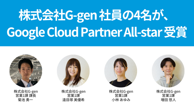 株式会社G-gen(本社:東京都新宿区、代表取締役:羽柴孝、以下G-gen)の菊池 勇一、小林 あゆみ、遠目塚 美優希、増田 悠人の計4名が、2023年12月12日に Google Cloud Partner All-stars に選出、表彰されたことをお知らせいたします。