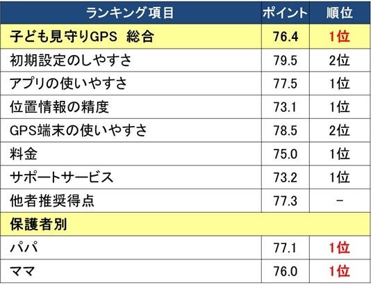 子ども向け専用のGPS端末機とスマートフォンアプリを通じた見守りサービスを提供する企業13社を調査対象とし、3歳~中学生を見守り対象としてサービスを利用している18~59歳の4,541人が回答した調査結果をもとに集計した「子ども見守りGPS」ランキングです。