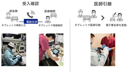 また、病院搬送後、従来紙に記入してもらっていた医師の署名等をタブレット上に記載し、引継ぎを行う運用とします。
