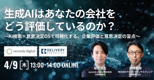データリテラシーの向上を通じてデータドリブンカンパニーへの変革を支援する株式会社デリバリーコンサルティング(本社:東京都港区、取締役CEO:内藤 秀治郎)は、企業の「AIネイティブ」への変革を支援するsecondz digital株式会社(本社:神奈川県横浜市、代表取締役:板井 龍也)と共催でWEBセミナーを開催いたします。