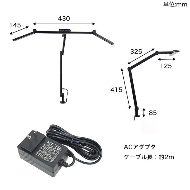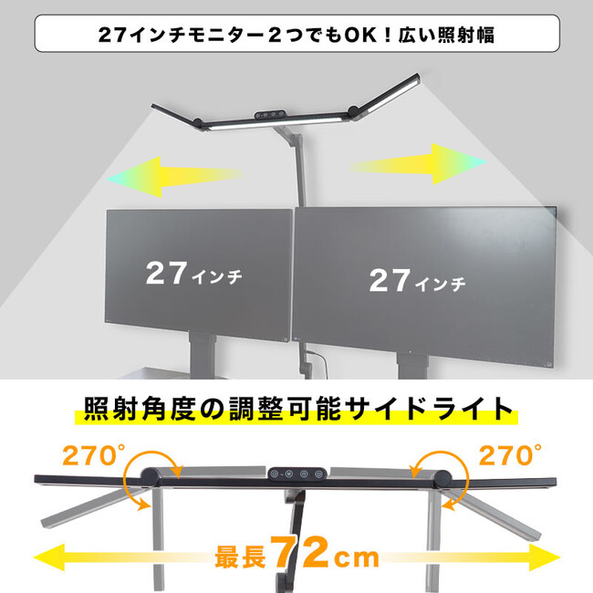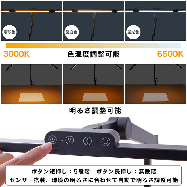 お手持ちの机に挟んで固定するクランプ式。天板の厚み1~6cm、出しろ4cm以上の机に取り付けできます。最大横72cm(中央部43cm、左右それぞれ14.5cm)。左右部分は回転させて横から照らしたり、上向きにLEDライトを向けることが可能。アーム部は3軸でそれぞれ上下に角度調整が可能でお好きな位置に固定できます。上部のタッチパネルでセンターLEDのオンオフ・明るさ調整(ワンタッチ5段階、長押し無段階)、左右(共通)のLEDオンオフ・明るさ調整(ワンタッチ5段階、長押し無段階)。3LED共通、温度(電球色~昼白色から昼光色)までワンタッチ5段階、無段階に切り替えが可能。