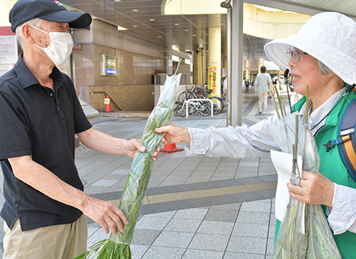 森林ボランティア団体の高槻里山ネットワークとNEXCO西日本、高槻市が4日、市民らに七夕を楽しんでもらおうと、JR高槻駅前で、間伐材を利用したササ約1000本を無料で配布しました。