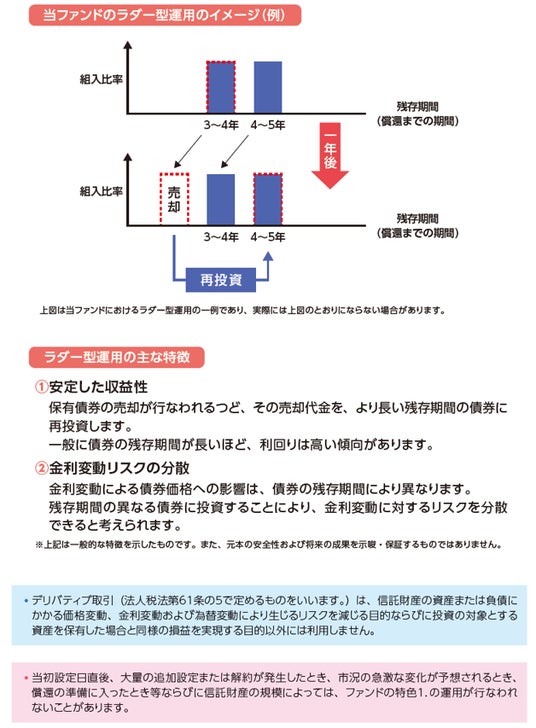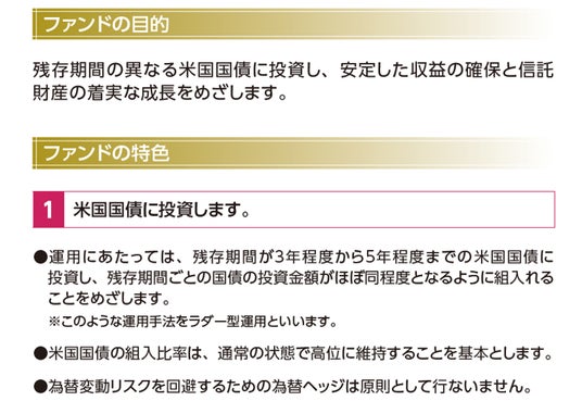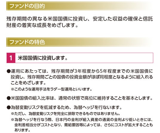 当ファンドは、原則として、残存期間が3年から5年程度までの米国国債に投資し、残存期間ごとの国債の投資金額がほぼ同程度となるように組入れるラダー(はしご)型運用を行ないます。ルールベースのアクティブETFとして組成することで、指数を使用せず、投資家の皆さまの負担するコストを抑えた商品設計としています。また、「為替ヘッジなし」「為替ヘッジあり」の2本を上場することで、相場観に応じた多様な投資が可能となります。