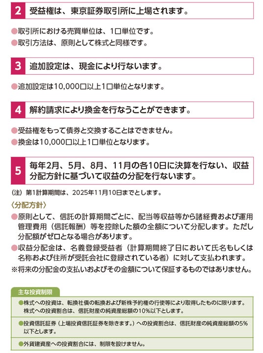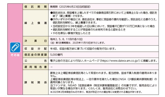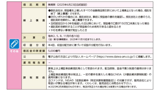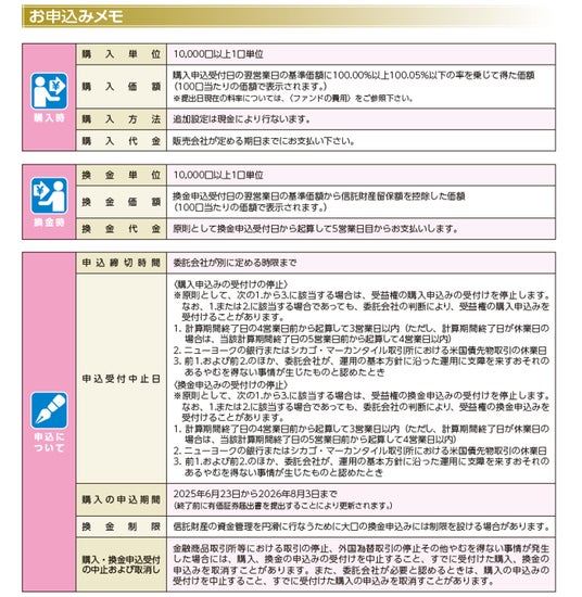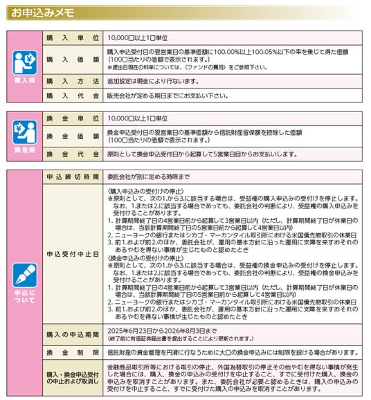 - 株式または金銭の拠出により当ファンドの取得(応募、追加設定)をご希望の場合には投資信託説明書(交付目論見書)を販売会社(指定参加者)よりお渡しいたしますので、必ず内容をご確認くださ い。