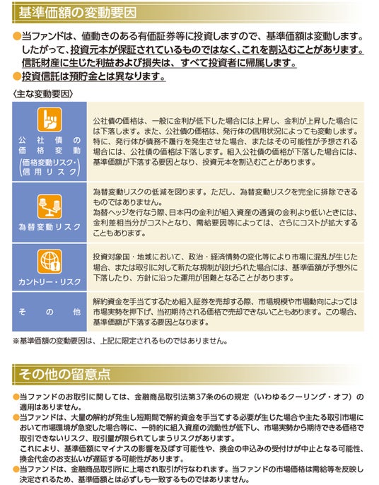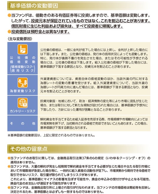 - 投資信託は値動きのある有価証券等に投資しますので、基準価額は大きく変動します。したがって、投資元本が保証されているものではありません。信託財産に生じた利益および損失はすべて投資者に帰属します。投資信託は預貯金とは異なります。