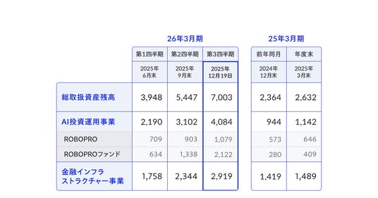 ・「AI投資運用事業」:「FOLIOが直接お客さまに提供する投資一任運用サービスに関連してお預かりしている資産(ROBOPRO等)」および「当社子会社が投資助言業を行っている金融商品の資産(ROBOPROファンド等)」の合計金額。「ROBOPROファンド」は公募のみを対象