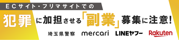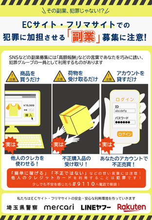 LINEヤフー株式会社(以下「LINEヤフー」)、株式会社メルカリ(以下「メルカリ」)、楽天グループ株式会社(以下「楽天」)は、ECサイトとフリマサービスの安心・安全な利用環境構築のため、埼玉県警察サイバー局とともに、犯罪に加担させる「副業」募集に関する注意喚起を本日行いました。