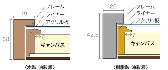 額装の素材は、木目を活かしたシンプルでナチュラルな風合いの「木製 油彩額」と、艶やかな表面と細身でシンプルなフレームの「樹脂製 油彩額」の2つのタイプがございます。