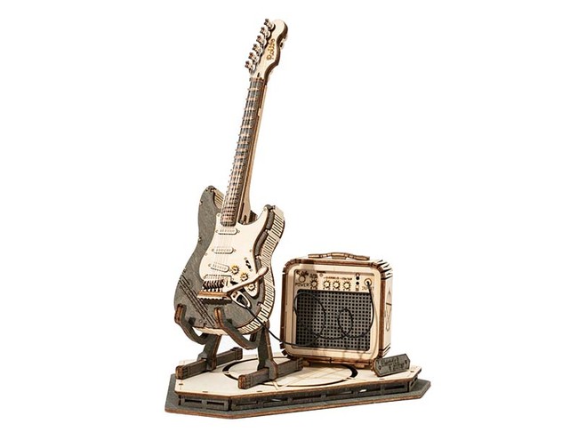 ギターとアンプを繋ぐコードや細いワイヤーを使った弦など、異素材パーツを使ったリアルさが特徴です。また、ウッドパーツにもこだわりがたくさん。例えば、エレキギターは本物同様ボディの左下と裏側に少し角度がついていて、組み立てながらアンプのつまみ位置を自分で決めることができます。また、ヴァイオリンは切込みの入った蛇腹パーツで曲線美を再現するなど、細部まで作り込まれています。