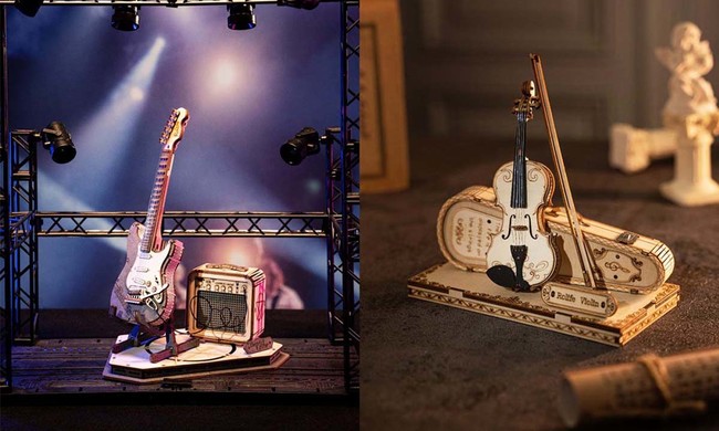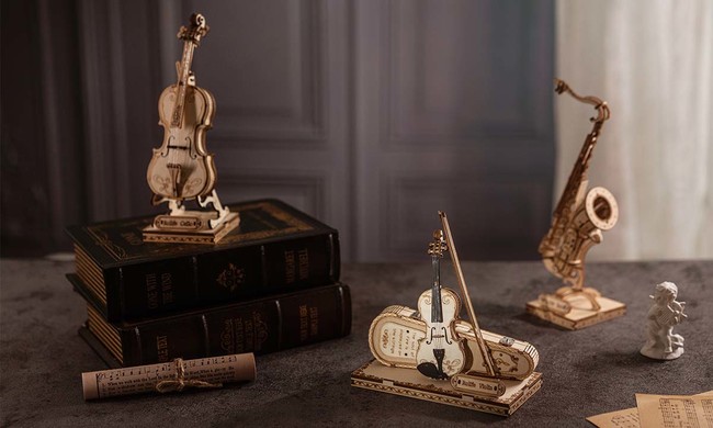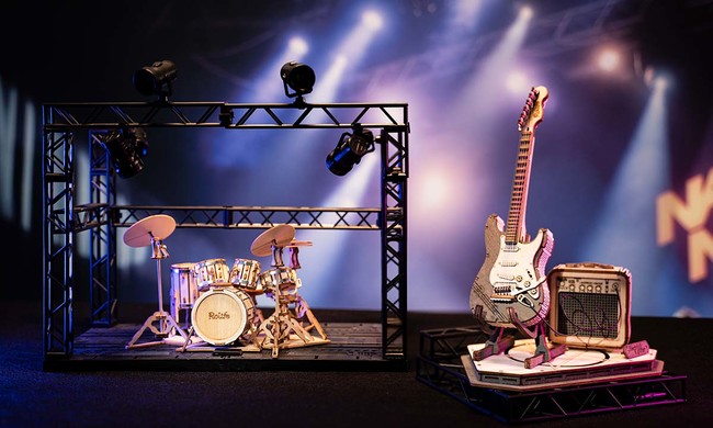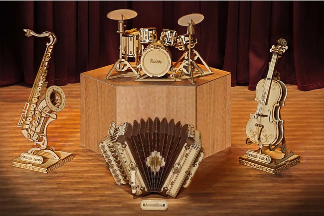 DIYクラフトキット「つくるんです(R)」の3Dウッドパズル楽器シリーズでは、テナーサックス、チェロ、ドラム、アコーディオン、ピアノの5種を展開中。今回追加されたエレキギターとヴァイオリンを合わせることで、自分だけのバンドやオーケストラを結成することができます。また、楽器シリーズの多くがステージや土台付きなので、飾った時に映えるウッドパズルシリーズとなっています。好きな人形やフィギュアと合わせて弾いている風に飾るのもおすすめです。