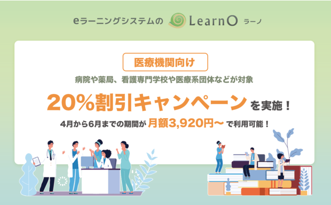 この度、2023年3月17日(金)までに「LearnO」を初めてご契約いただいた医療機関で、キャンペーンコード「MEDICAL2023」をご提示いただいたお客様に限り、2023年4月から6月までの利用料を20%OFFとするキャンペーンを実施いたします。これにより、月額最低3,920円(※1)よりLearnOをご利用いただけます。本キャンペーンのご利用をご希望の場合は、お問い合わせフォーム(https://inquiry.learno.jp/inquiry/)のキャンペーンコード入力欄に「MEDICAL2023」をご入力いただき、お問い合わせください。