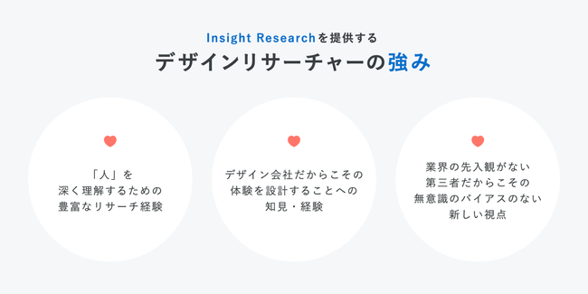 Insight Researchでは、デザインリサーチャーの「人」を深く理解することへの豊富な経験、デザイン会社としての体験設計への知見・経験、さらに先入観のない第三者だからこその客観的かつ新しい視点で、「意味のあるアクション」につながる質の高いリサーチが可能です。