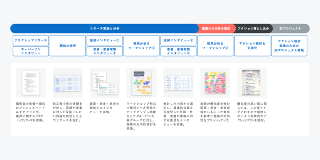 Insight Researchでは、リサーチの1.目的設定と分析、2.施策方向性検討、3.アクションへの落とし込みまでグッドパッチのデザインリサーチャーが一貫してクライアントと並走する、探索型リサーチを実施します。