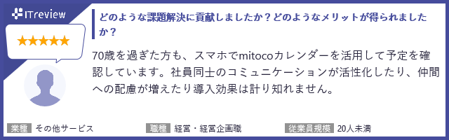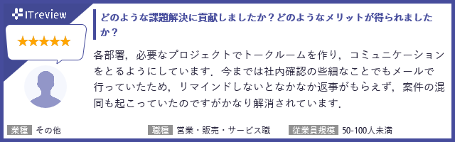mitocoはカレンダーやワークフローなどのグループウェアとしての機能の充実やSalesforceとの連携を高く評価されていますが、コミュニケーションツールとしての局面からも評価されています。チャット機能や掲示板の利用による情報共有に加え、社員の活動状況や顧客に関する情報が見える化されることで、社員同士のコミュニケーションを活性化させる効果を実感する声も寄せられています。