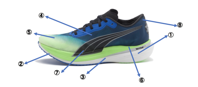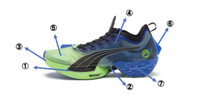 1.NITRO ELITE FOAM(ニトロ エリート フォーム):1秒でも早く走るために開発されたプーマ史上最高の推進力と反発力を生むテクノロジー